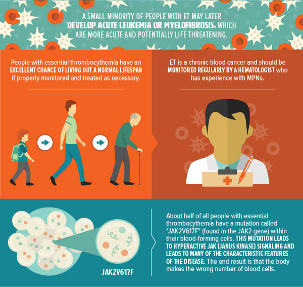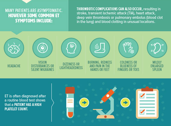 ET is a chronic hematologic malignancy, so it is important for patients to regularly consult with a hematologist and to report any symptoms such as visual disturbances, unexplained pain, numbness, tingling or bruising. Patients who experience symptoms from ET will require treatment.