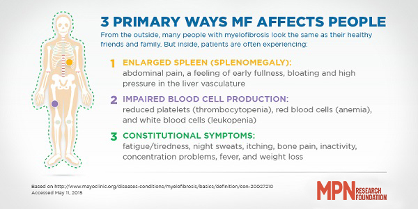Myelofibrosis symptoms are often caused by an enlarged spleen and/or insufficient numbers of normal blood cells and chronic inflammation.